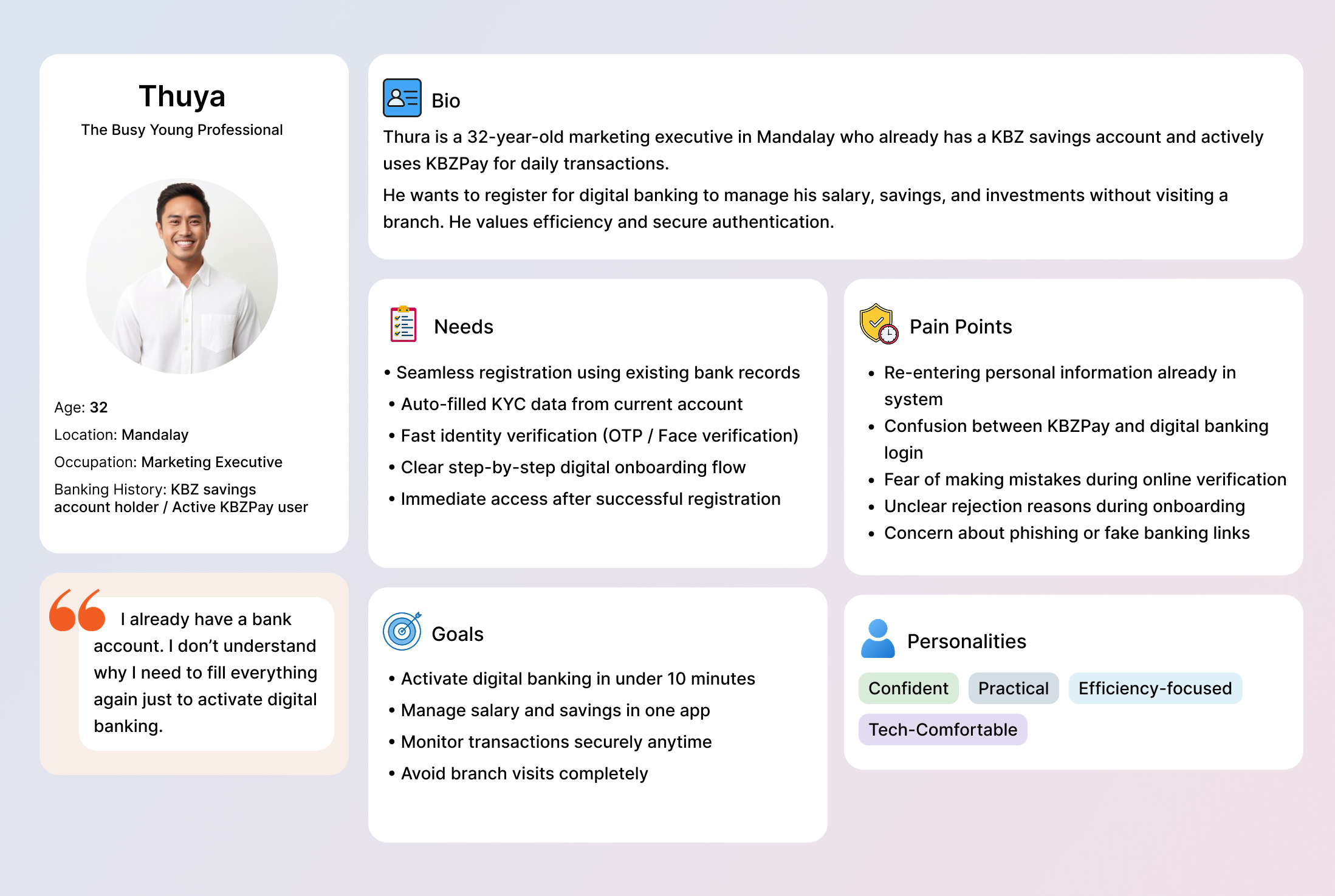 This case study focuses on designing the authentication architecture and registration flow for existing KBZ customers transitioning to digital banking.